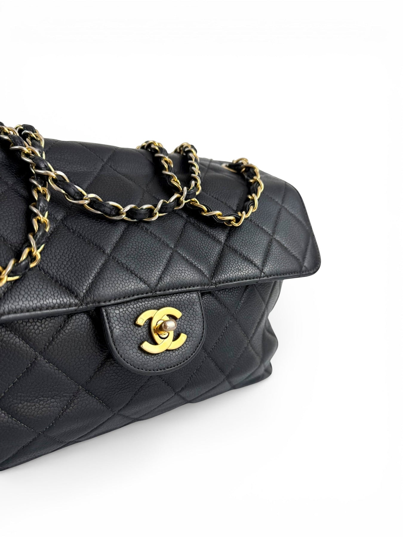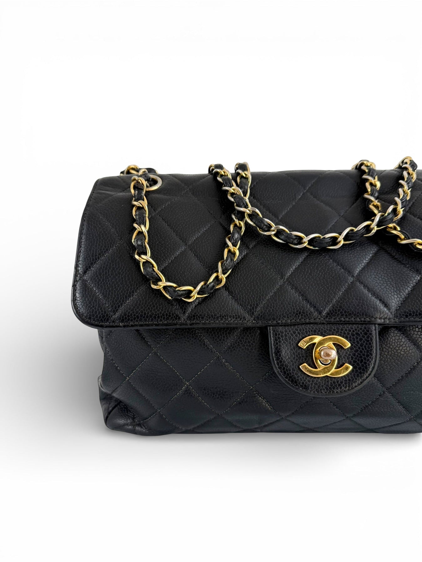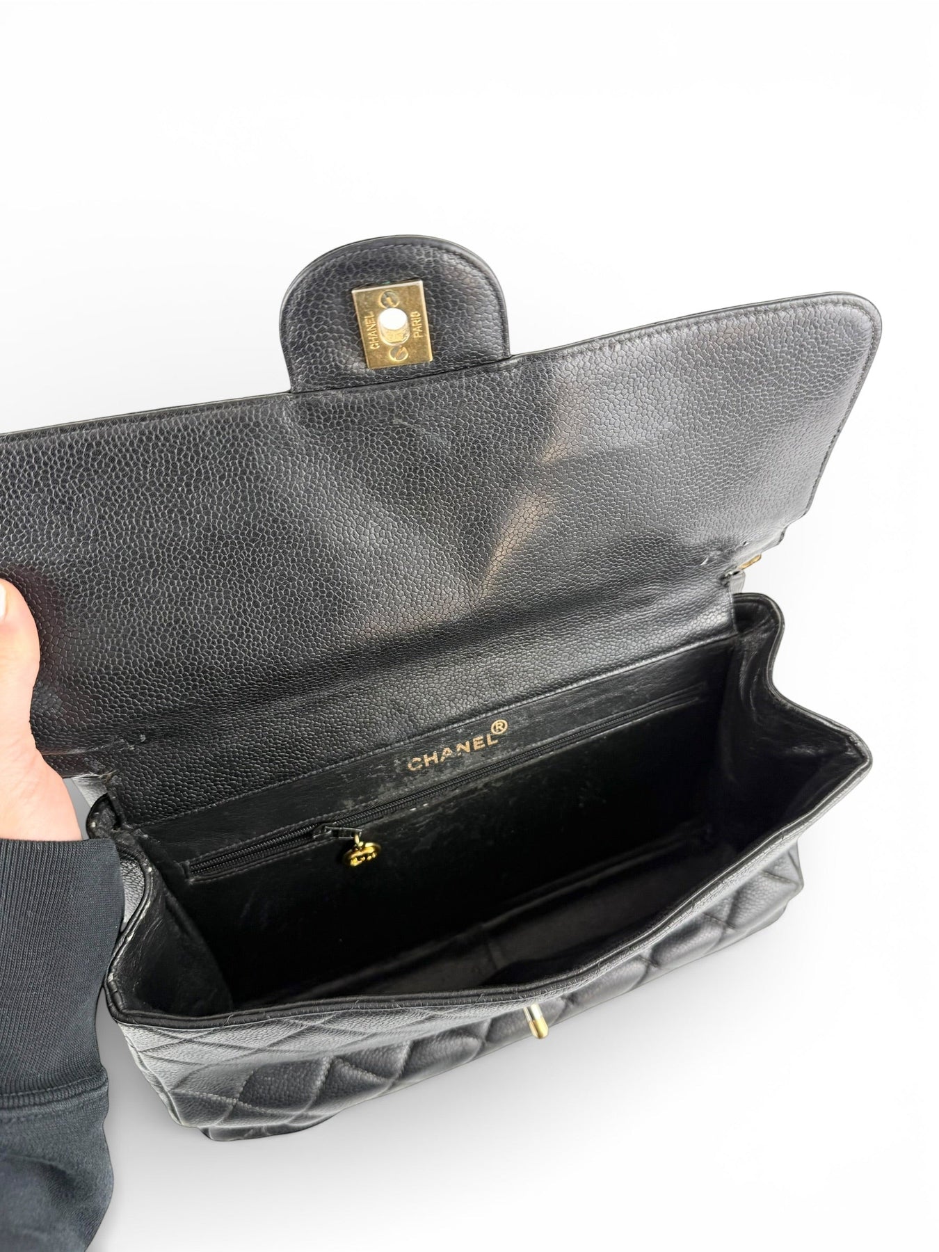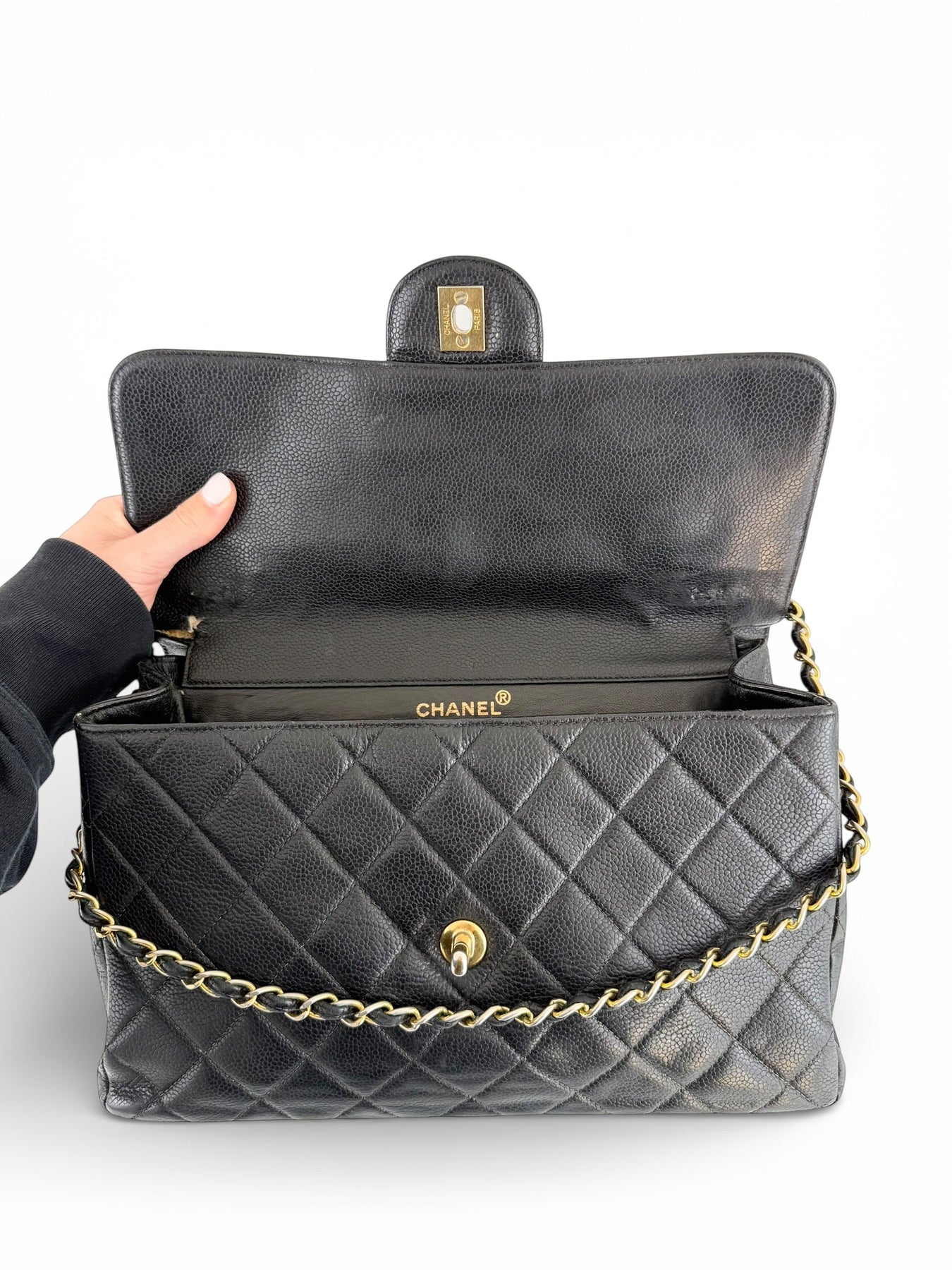 Vintage 90s Chanel Double Sided Black Caviar 24K GHW 30cm Classic Flap Bag
